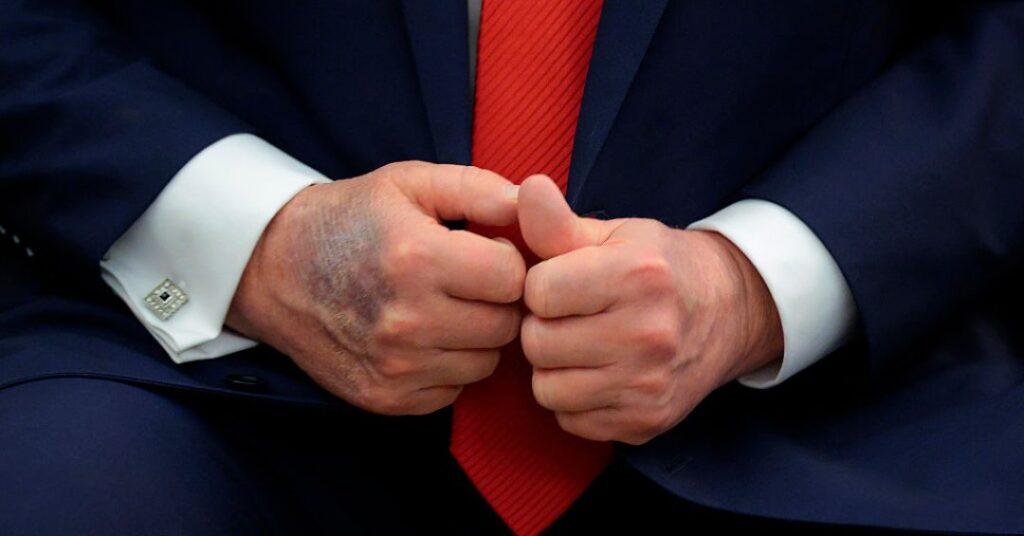 Donald Trump aparece com hematomas e maquiagem nas mãos