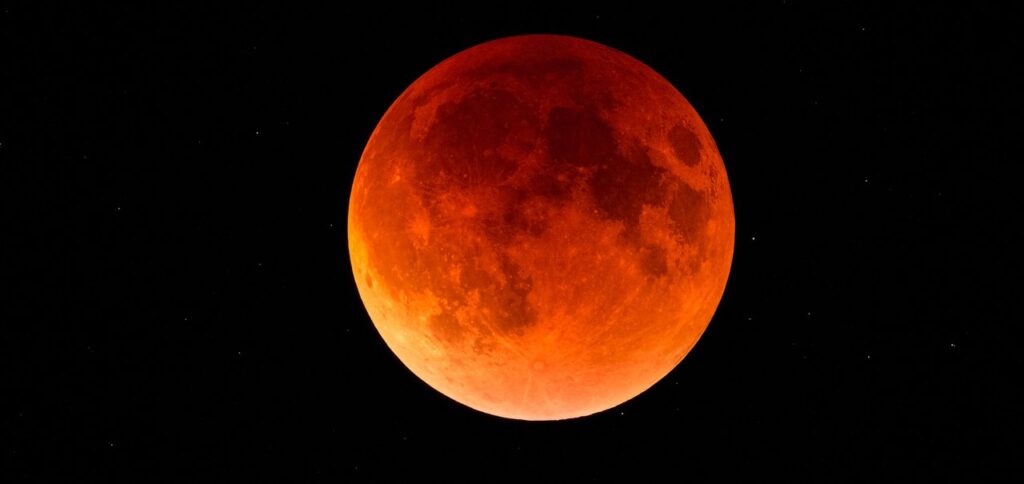 Um eclipse lunar ocorre quando a Terra, o Sol e a Lua se alinham e o satélite é “coberto” pela sombra do planeta, provocando a chamada zona de “umbra”. O fenômeno só acontece quando a Lua está na fase cheia e pode ser parcial — quando a Lua não é 100% coberta pela sombra da Terra — ou total — neste, o planeta bloqueia toda a luz do Sol e impede que chegue no satélite.