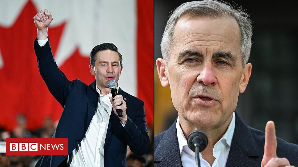 Legenda da foto, O conservador Pierre Poilievre (à esquerda) e o liberal Mark Carney (à direita) são os principais candidatos nas eleições canadenses