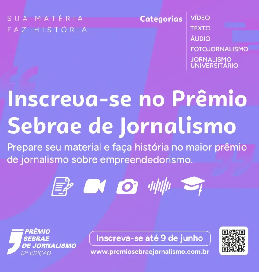 Oportunidade à vista para profissionais de imprensa e estudantes de comunicação: o Prêmio Sebrae de Jornalismo (PSJ) está com inscrições abertas de hoje (7) até 9 de junho. São quatro categorias principais: Texto, Áudio, Vídeo e Fotojornalismo. Há também, pelo segundo ano consecutivo, a categoria especial Jornalismo Universitário.