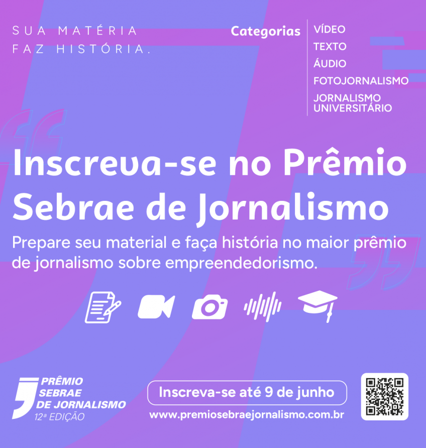O Prêmio Sebrae de Jornalismo está na reta final para inscrições, que vão até o dia 9 de junho e podem ser feitas pelo site www.premiosebraejornalismo.com.br. O prêmio, que está em sua 12ª edição, reconhece as melhores produções jornalísticas sobre o universo do empreendedorismo, com foco nos pequenos negócios, em quatro categorias principais: Texto, Áudio, Vídeo e Fotojornalismo. E pelo segundo ano, conta com a categoria Jornalismo Universitário.
