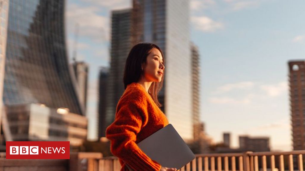 Mulher segurando pasta e com olhar confiante em meio a prédios espelhados