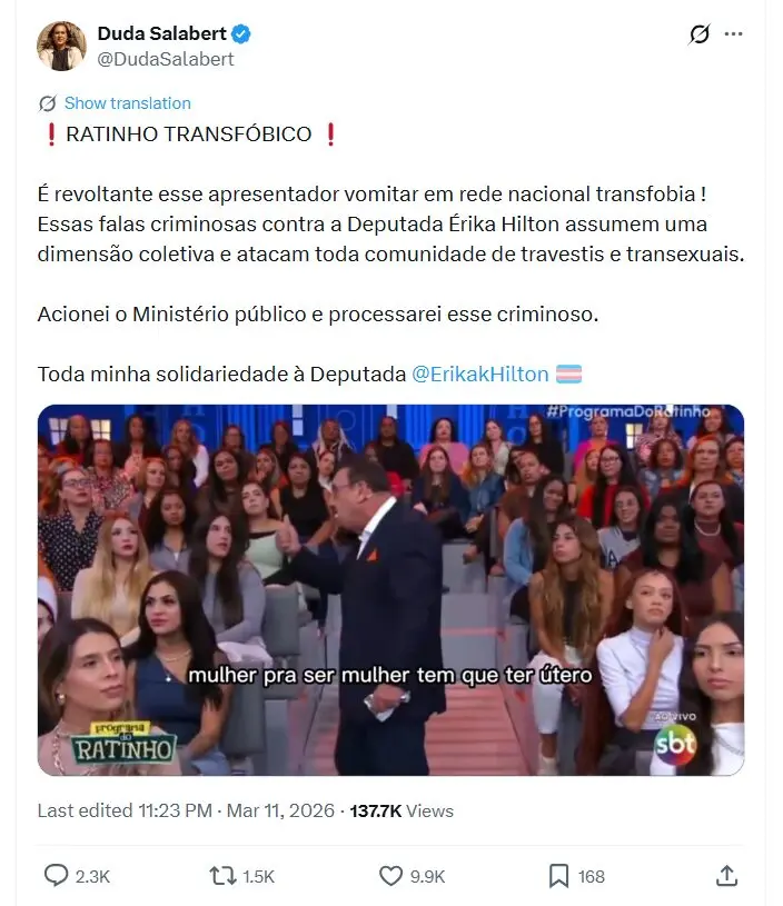 Em uma postagem na rede social X, Duda Salabert (PDT-MG) compartilhou o trecho da fala de Ratinho, chamando-o de “transfóbico”. “É revoltante esse apresentador vomitar em rede nacional transfobia! Essas falas criminosas contra a Deputada Érika Hilton assumem uma dimensão coletiva e atacam toda comunidade de travestis e transexuais. Acionei o Ministério público e processarei”, escreveu.
