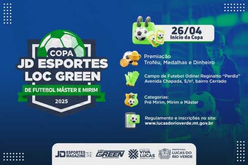 Estão abertas as inscrições para a Copa Municipal JD Esporte / Loc Green de futebol Máster e Mirim 2025. A competição promovida pela Prefeitura de Lucas do Rio Verde, por meio da Secretaria de Esporte e Lazer, conta com patrocínio das empresas JD Esportes Magazine e Via Brasil Transporte e Turismo.