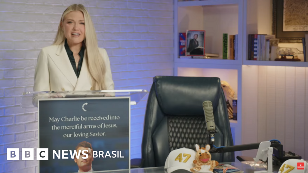 Segurando as lágrimas em alguns momentos, Erika Kirk falou ao lado da cadeira que Charlie Kirk usava para fazer transmissões, agora vazia.
