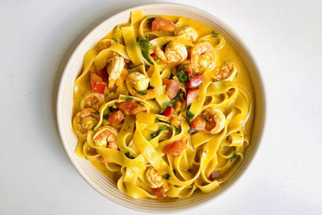 Quando o macarrão estiver cozido, devolva o camarão ao molho e junte o tomate, a