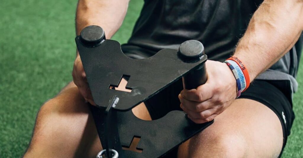 O triângulo é um acessório que pode substituir a barra tradicional em exercícios que envolvem algum tipo de puxada. Em vez de uma barra horizontal, em que a pegada ocorre “de frente” (podendo ser supinada ou pronada), o triângulo é um puxador permite que a pessoa agarre lateralmente, graças ao seu formato .