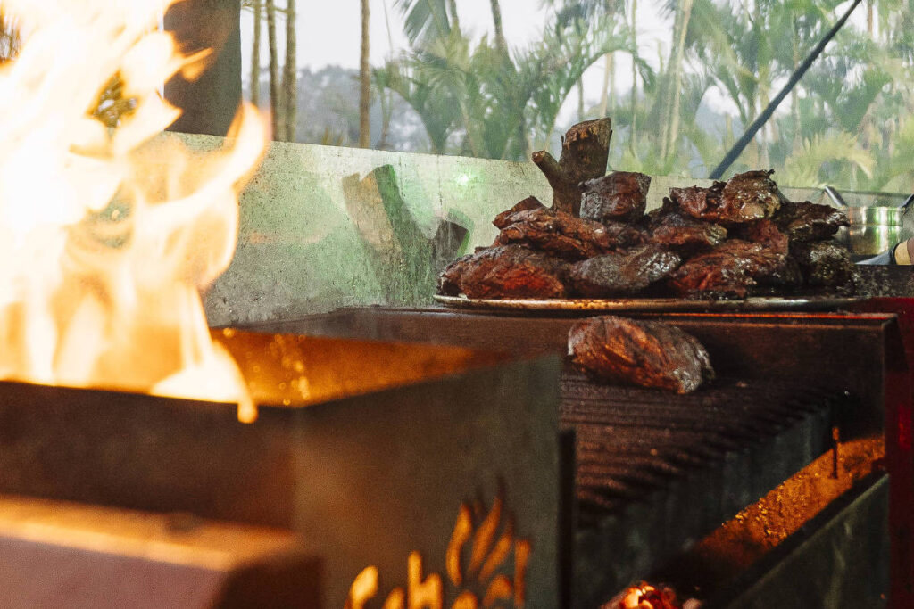 Várias estações gastronômicas se espalhavam pelo espaço, todas explorando diferentes preparos ao fogo. O cardápio foi vasto: peixes, como o bluefin tostado em uma panela furada sobre carvão, que ganhava uma crosta defumada e era servido sobre arroz, até cortes bovinos clássicos, a exemplo do Denver steak com manteiga de café.