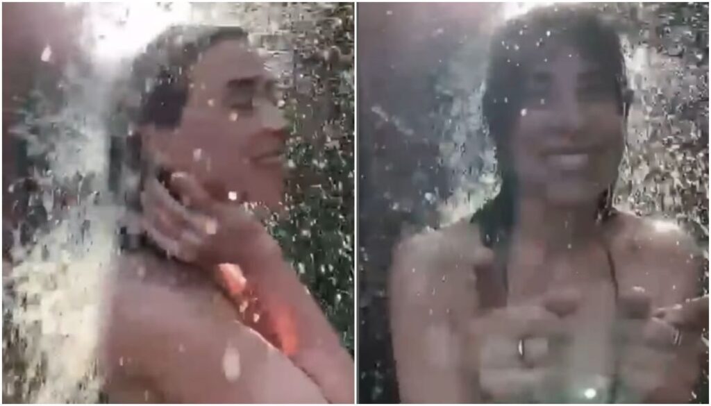 No registro, a atriz aproveita as férias tomando banho de chuveirão e se refrescando no calor do Rio de Janeiro.