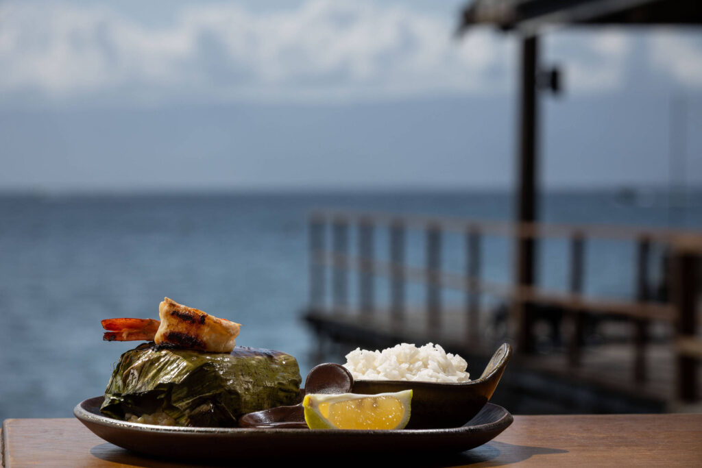 O papillote do chef Fernando Bragion leva peixe robalo envolto em uma folha de bananeira com recheio de farofa de banana e camarão (R$ 118). O prato pode ser degustado com vista para o mar. Para acompanhar, vem uma porção de arroz de coco.