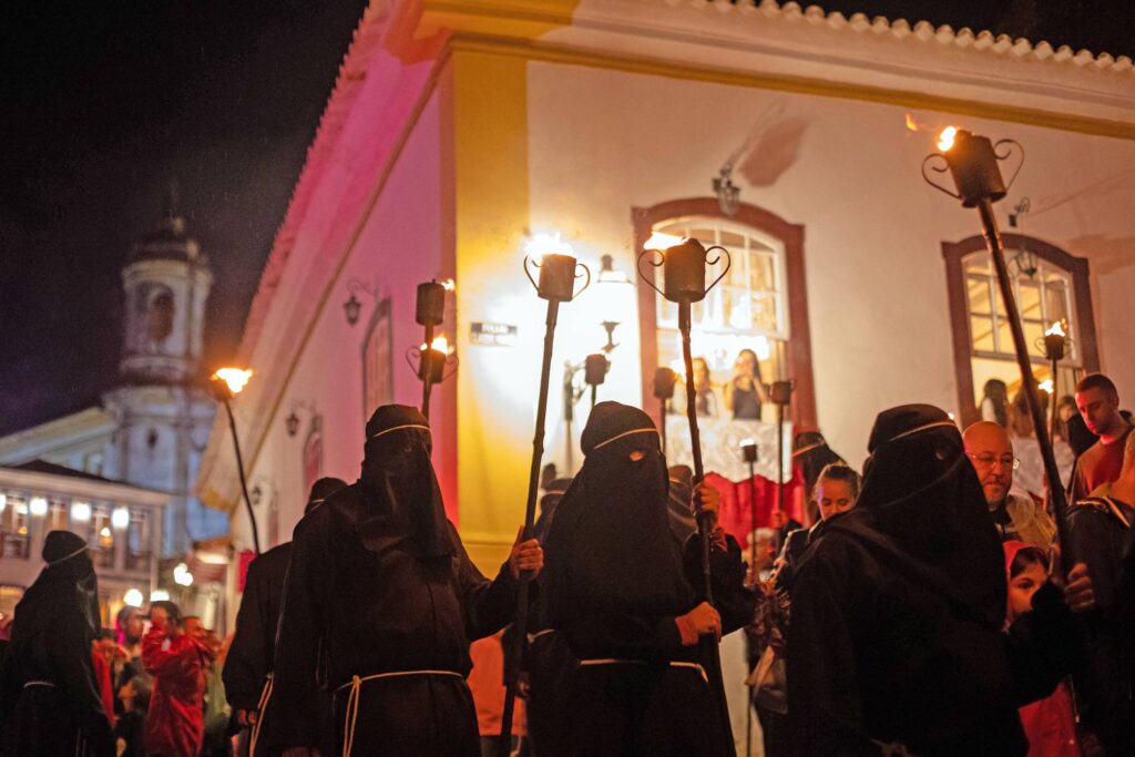 Essa procissão, que começa às 22h30 na catedral em direção à praça Minas Gerais, simboliza a busca e prisão de Jesus no Jardim das Oliveiras. Sob a luz de tochas, moradores encapuzados percorrem as ruas em cortejo.