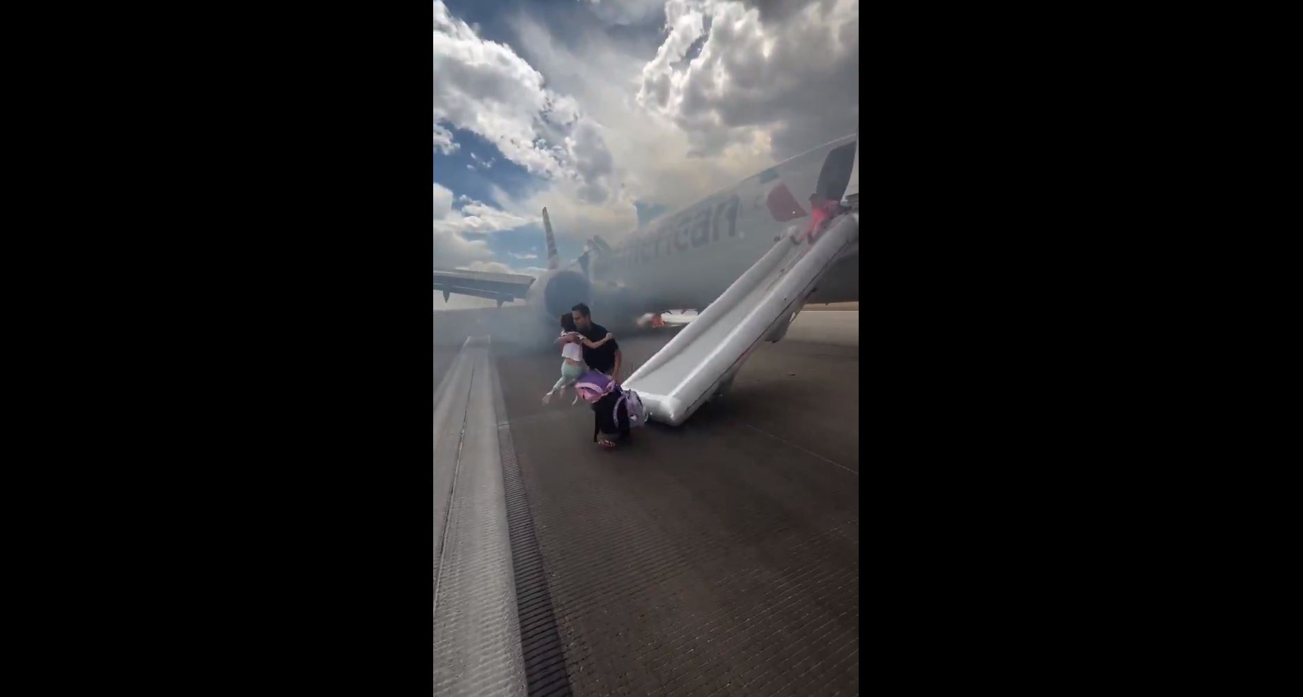 Um vídeo mostrou um homem segurando uma criança com uma mão, a mochila com a outra, ele se desequilibra ao sair do escorregador e acaba tropeçando. A regra é clara: bagagem de mão deve ser deixada para trás em caso de emergência a bordo!