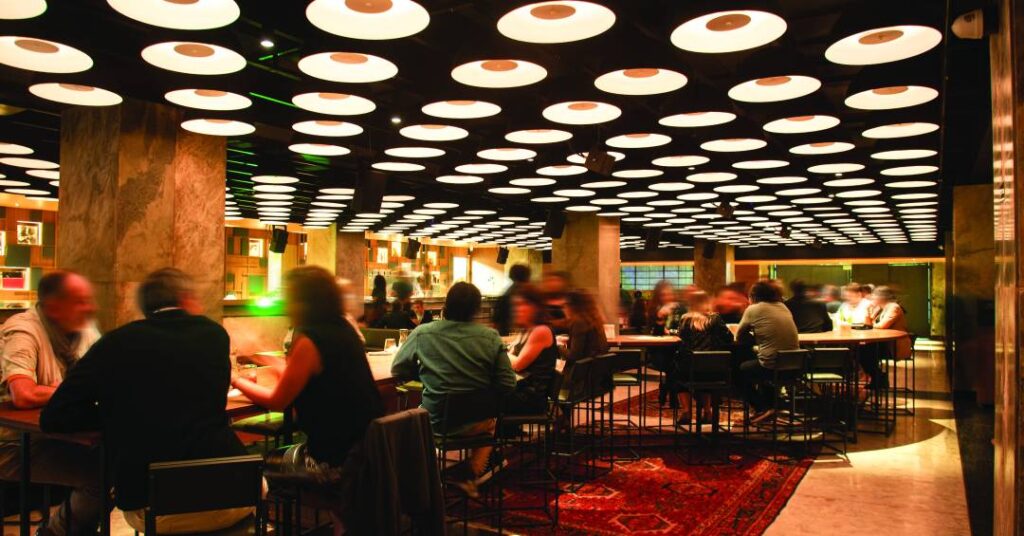 Não é raro que, em certo ponto da noite, a galera se levante, sob as 350 luminárias circulares que mudam de cor, e comece a dançar, ainda que não haja uma pista. “Não tem jeito, tocou Marina Lima”, comenta um garçom assim que o tecladinho de Fullgás ressoa pelas trinta valiosas caixas de som.
