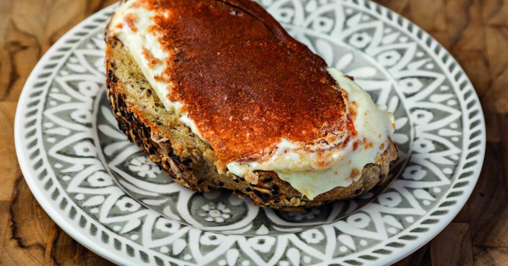 Lá mesmo, vale pedir a fatia de rústico ou multigrãos com requeijão de corte na chapa (R$ 24,00), de casquinha dourada na cobertura.