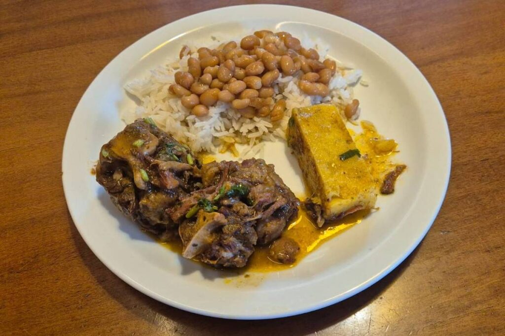 A visita ocorreu numa sexta-feira, e um dos pratos do dia era rabada (R$ 52) com arroz, feijão e polenta. Como já estávamos satisfeitos, pedimos para levar. Então houve um acréscimo de R$ 3 por conta da embalagem. Montei o prato em casa e provei. Cheio de sabor, mas um pouco diferente do que imaginava. Vem com a polenta mais firme que cremosa e a carne assumidamente gordurosa.