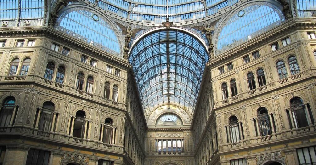 O projeto do arquiteto Emanuele Rocco agrega um elemento religioso à construção: a galeria foi desenhada em formato de cruz, com quatro alas abobadadas e uma cúpula oval no centro com 57 metros de altura. Uma das alas se dirige para a via Toledo, a principal de Nápoles, e a outra se abre para o Teatro San Carlo, outro ponto turístico indispensável.
