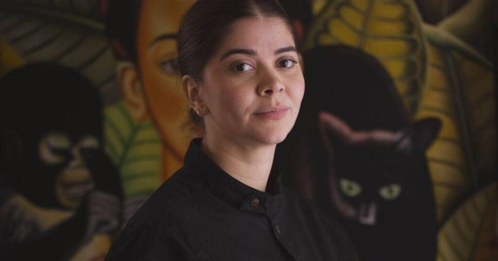 Mulher sentada de cabelos escuros e soltos sobre a camisa branca e com uma calça preta