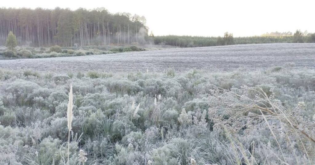 Nas primeiras horas da manhã, os termômetros marcaram 5°C. Com o frio mais intenso durante a madrugada, a paisagem ganhou aquele aspecto típico da estação, com vidros esbranquiçados, jardins e campos cobertos por uma fina camada de gelo e um cenário de aparência congelada que, mesmo sendo comum na região, continua chamando a atenção de moradores e visitantes.
