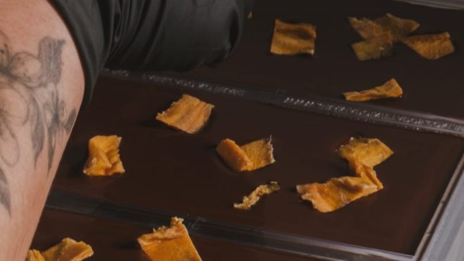 A barra de chocolate intensa utiliza cacau de um manejo agroflorestal de Tomé-Açu, no Pará. Já na drágea Banoffe, o cacau utilizado vem de comunidades ribeirinhas do rio Acará, também no Pará.