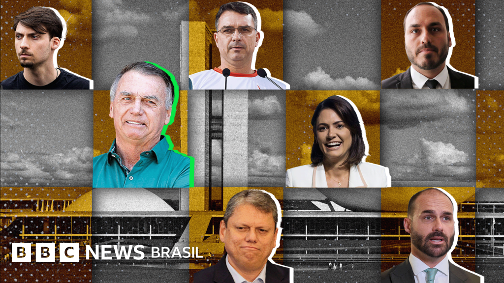 Colagem de fotos com o Congresso Nacional no fundo e fotos de Michelle, Jair, Flavio, Eduardo, Tarcísio, Jair Renan e Carlos Bolsonaro.