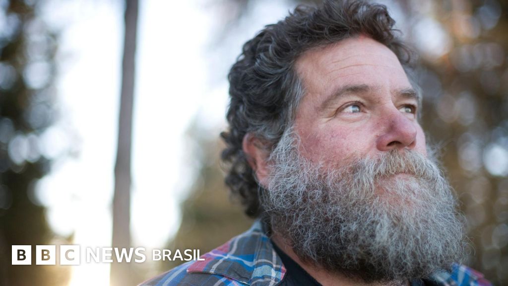 Homem com barba grisalha olha ao longe, aparentemente em um bosque.