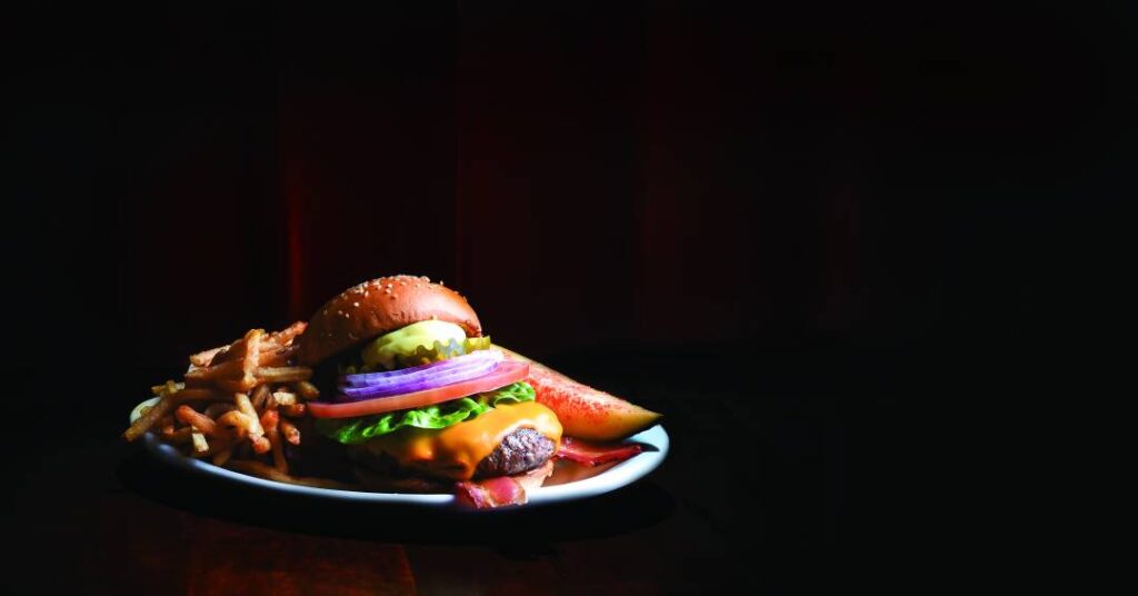 Todos os hambúrgueres vêm acompanhados de uma porção de batata frita fininha e crocante no mesmo prato.