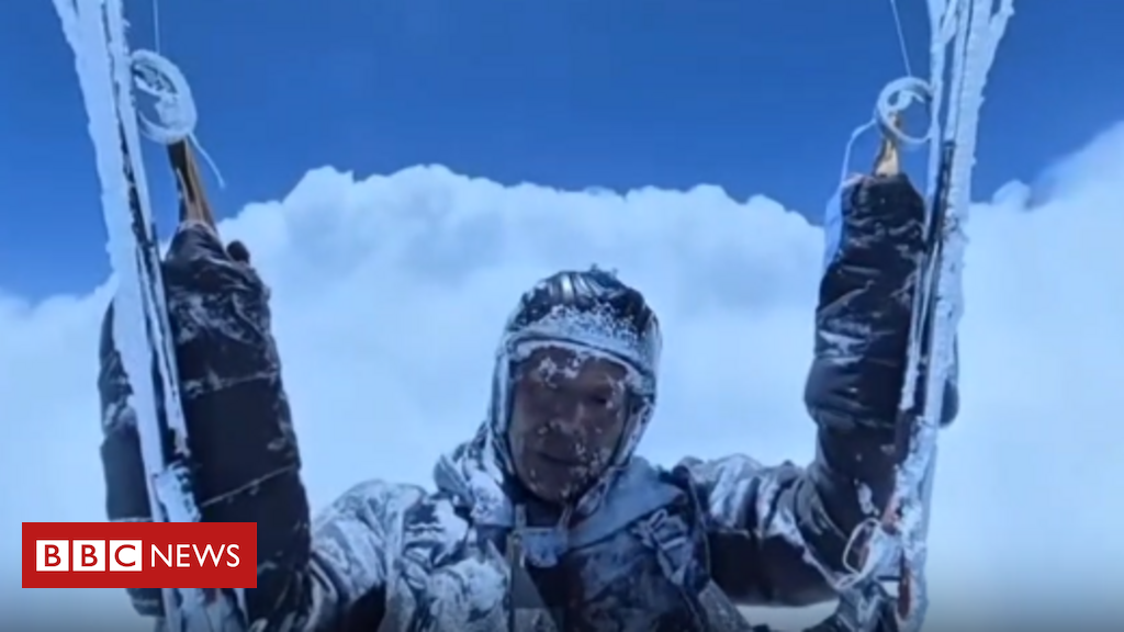 Nas imagens, Peng segura os controles do parapente, com o rosto e grande parte do corpo cobertos por cristais de gelo.