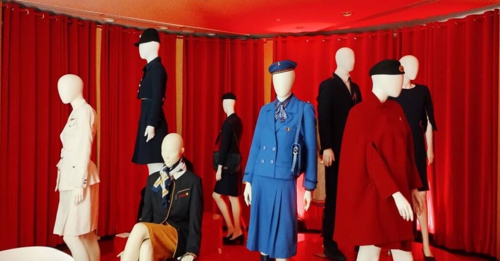 Ao subir as escadas em espiral, o primeiro andar reserva uma exposição dos uniformes da companhia no decorrer das décadas. Assinados por designers de moda espanhóis como Alfredo Caral e Elio Berhanyer, é possível vestir esses trajes e “desfilar” para uma câmera.