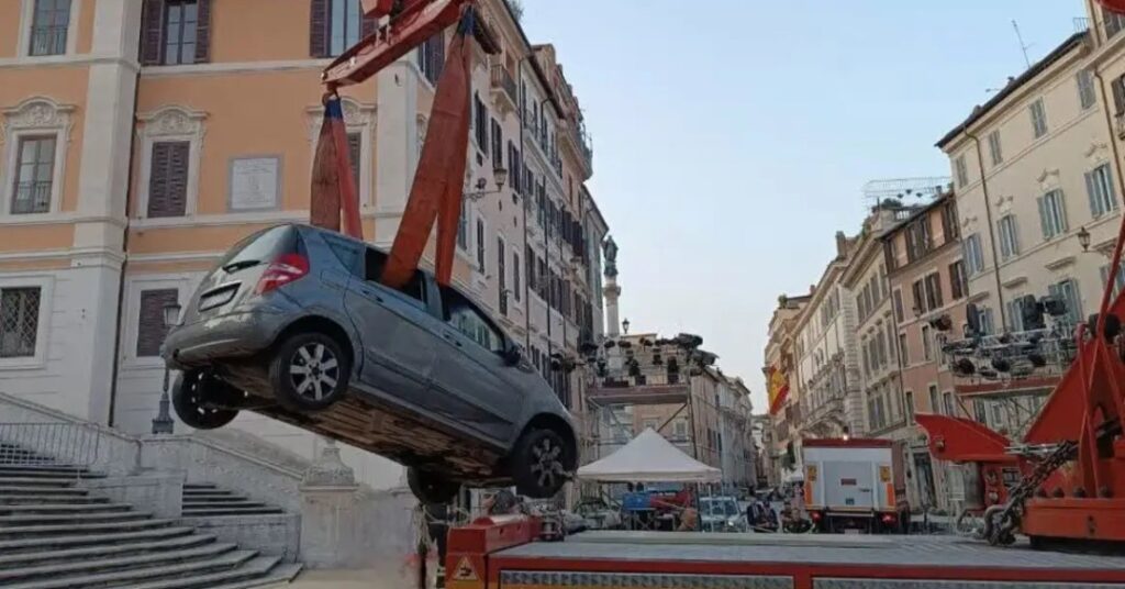 Em plena madrugada de terça-feira (17), Roma foi palco de uma cena que parecia saída de um filme, só que sem roteiro. Um italiano de 80 anos tentou descer de carro a Escadaria da Praça de Espanha, ponto turístico incontornável da capital italiana. Ele estava dirigindo um Mercedes Classe A quando entrou na área histórica, que conecta a praça Piazza di Spagna à igreja da Santissima Trinità dei Monti, e ficou preso entre os degraus.