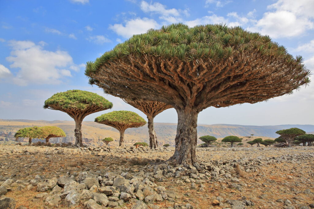 Entre elas, três se destacam. Uma delas é a a árvore do dragão. Com um formato semelhante ao de um cogumelo, tem galhos que expandem a sua sombra e ajudam a reter água no solo abaixo dela. Já a rosa do deserto é uma suculenta com troncos que retêm água, e por isso são mais cheios. A forma é tão peculiar que é impossível encontrar versões idênticas na natureza. Por fim, a árvore de olíbano conecta Socotra ao passado —sua resina, valorizada por egípcios, gregos e romanos, era usada para produzir incensos e medicamentos.