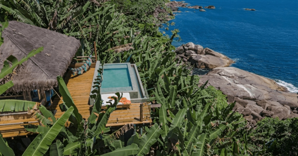 Do mesmo anfitrião e no mesmo terreno da hospedagem anterior, desta vez o acesso à acomodação é bem mais fácil e sem escadas. O ambiente é todo integrado e pode ser “separado” por uma cortina. Além disso, o bangalô se abre para um deck com piscina aquecida e guarda-corpo de vidro, para não bloquear a vista do mar. Ideal para casais, mas com capacidade para até três hóspedes, a acomodação reúne um quarto com detalhes em madeira e cama king size e uma sala com sofá-cama. Reserve aqui.