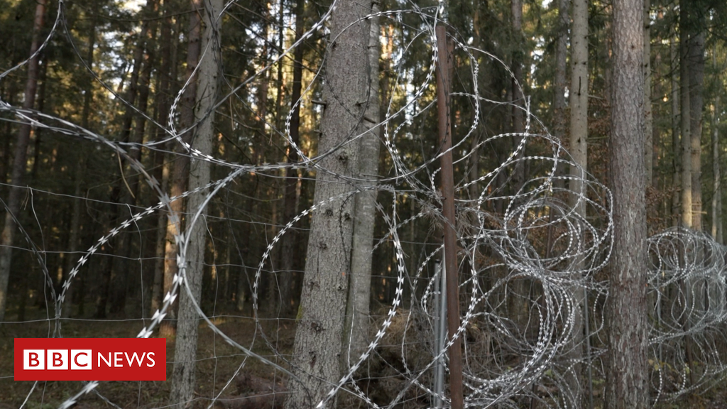 Legenda da foto, Imigrantes usam escadas e alicates para cruzar a cerca de arame farpado instalada pela Polônia em 2022