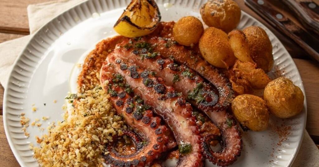 Ela incluiu receitas do mar, caso do polvo grelhado com batata rústica (foto; R$ 149,00).