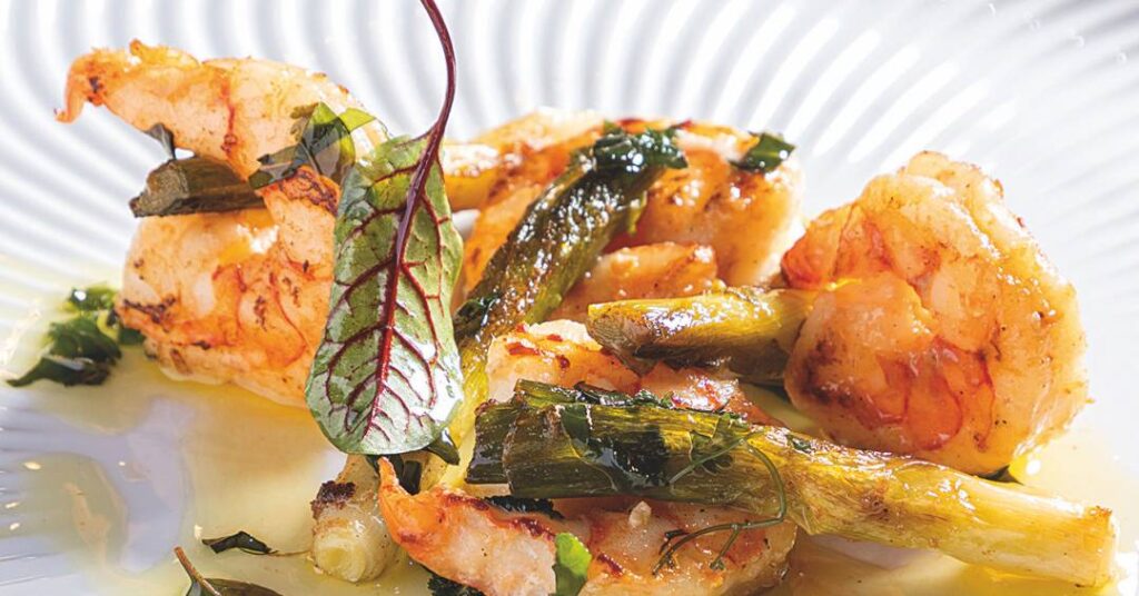 Feito ao forno com a pele, o filé de robalete de cozimento perfeito vem banhado por emulsão de champanhe e na companhia de erva-doce cozida. Outro primor é a composição de quatro camarões assados com alho- -poró e azeite de ervas (R$ 310,00).