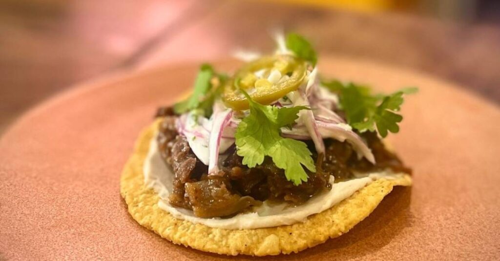 Tortilla crocante de milho, carne de sol de cordeiro guisada, frijoles refritos (pasta de feijão), salada fresca de cebola-roxa, maxixe, pimenta , coentro e coalhada de ovelha