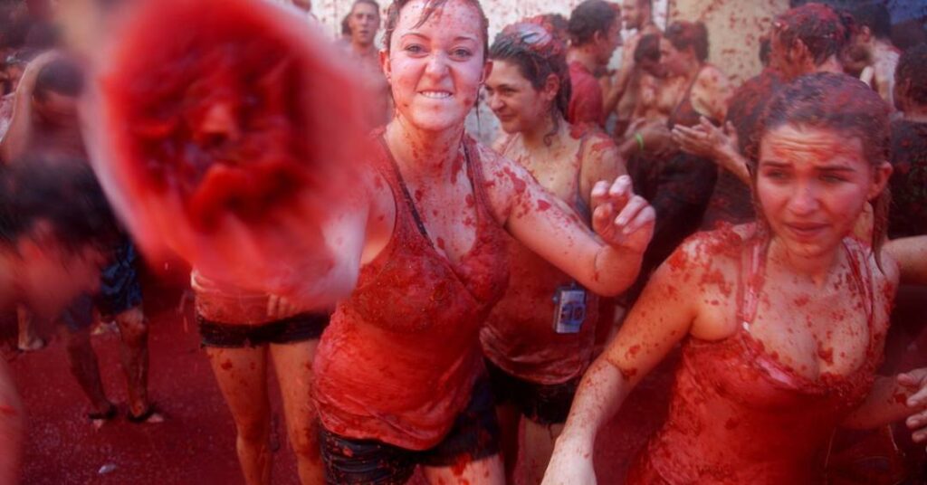 As imagens correm o mundo todos os anos: ruas e participantes tomados de vermelho, frequentemente com óculos de mergulho para proteger os olhos e seguir arremessando os frutos em quem está ao redor.
