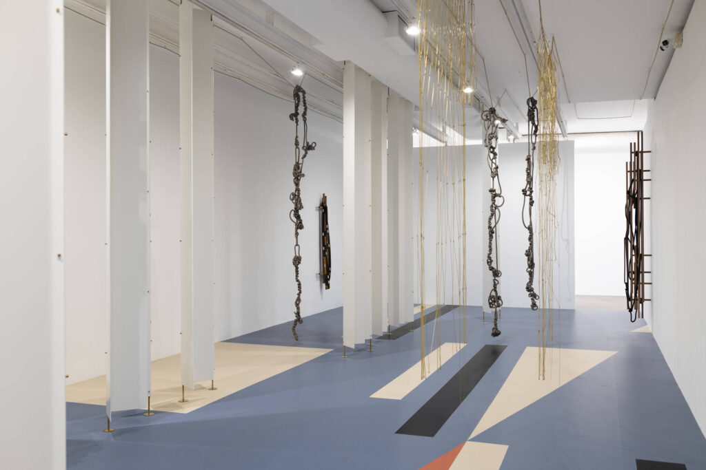 Um emaranhado de cordas de couro pende do teto, sustentado por uma fina corda de cânhamo que se estende por toda a sala. Entrelaçado em si mesmo, o conjunto ora se revela, ora se esconde por entre as frestas de estruturas brancas que se confundem com as paredes e conduzem o espectador pelo ambiente.