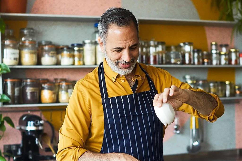 Cada receita tem sua história particular. O homus é um bom exemplo. Eu era purista: grão-de-bico, tahine, cominho, limão, alho. Rejeitava variações. Com o tempo, e talvez a idade, tornei-me mais tolerante. Entendi que homus pode significar coisas diferentes. Helen, por exemplo, não cresceu com homus, mas tem formação clássica. Ela criou um homus com erva-doce e pimentões assados, uma vibe mediterrânea francesa. Colocamos as duas versões lado a lado, mostrando a riqueza das experiências, não uma única “autenticidade”, que é um conceito falho.
