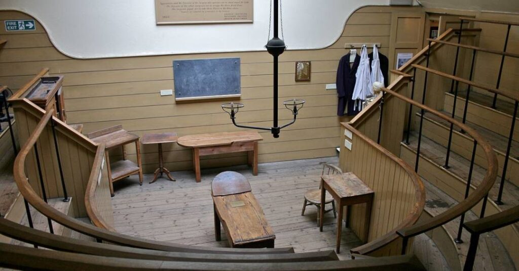 Como o “teatro” no nome indica, o espaço tinha uso duplo: era tanto um local para a realização de cirurgias de verdade quanto uma área de aprendizado. O salão é rodeado por pequenas arquibancadas semicirculares onde os estudantes se posicionavam para assistir à cirurgia e fazer anotações. Embaixo, no centro, ficava o espaço para a maca onde a operação seria realizada.