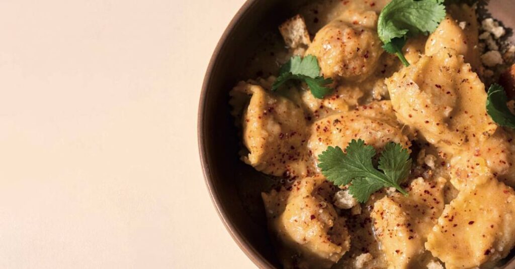 A receita junta a massa italiana agnolotti com elote, o milho grelhado das ruas do México.