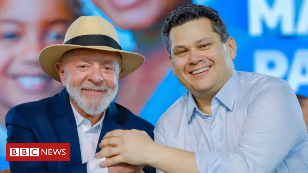 Legenda da foto, Embusca de apoio político no Congresso e no Amapá, Lula faz acenos a presidente do Senado, Davi Alcolumbre e defende pesquisas sobre petróleo no Estado
