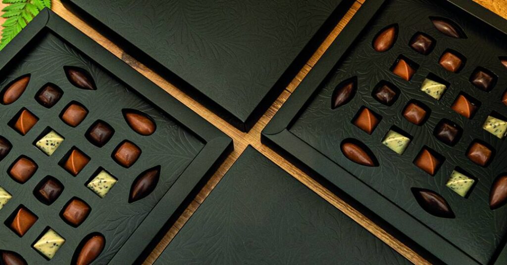 Cada bombom, que pode ter recheios como cupuaçu, nibs de cacau e cumaru ou taperebá, fruta também conhecida como cajá, foi pensado pelo sabor e também pelo significado. Os formatos remetem a elementos da natureza, como folhas e o próprio fruto cacau, e reforçam a conexão simbólica entre o chocolate e o território de origem de sua matéria-prima.