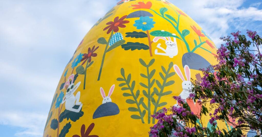 Neste ano, a obra de arte que estampa o ovo gigante da Osterfest é do escritor e ilustrador de livros infantis Guilherme Karsten. Em cores vivas, ela faz referência à brincadeira de Caça aos Ovos de Páscoa, com personagens divertidos e uma atmosfera que remete à infância. O colorido da paleta do autor também está presente na decoração e nas 105 mil casquinhas de ovos naturais da Osterbaum gigante.