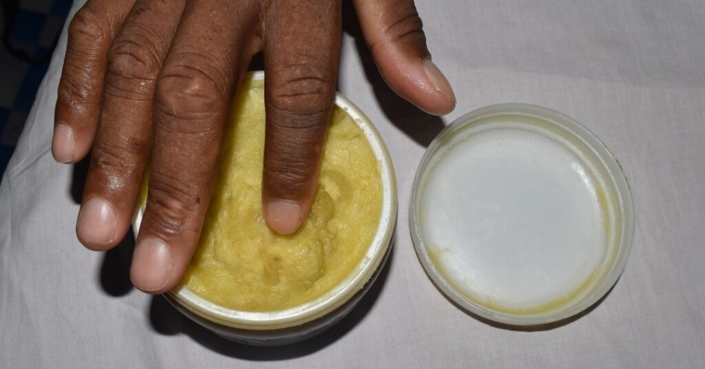 Na pele, a manteiga de karité pode ser aplicada com as mãos, esfregando suavemente para espalhá-la o máximo possível e propiciar uma melhor absorção.