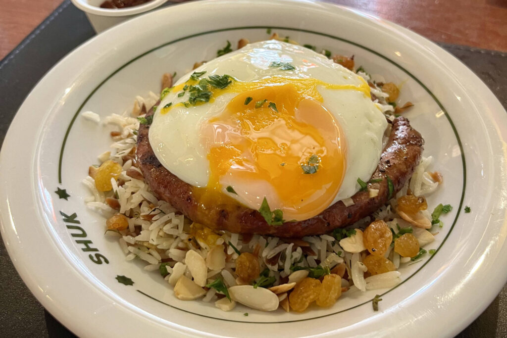 O que poderia ter de tão diferente num prato de arroz com linguiça, saladinha e ovo frito, afinal? Bem, muitas coisas, como provou o merguez a cavalo (R$ 65). Começando pelo arroz, uma receita libanesa que combina o basmati arisoni (massa de sêmola de trigo) na manteiga, lâminas de amêndoas, dill e uvas passas brancas. Rico em contrastes, acompanhou muito bem a linguiça de cordeiro que veio em cima. Suculenta e condimentada na medida, ela agregou uma ligeira picância ao conjunto. Para coroar, um ovo frito de gema mole. A salada do dia vem numa pequena porção, e na ocasião era tabule.