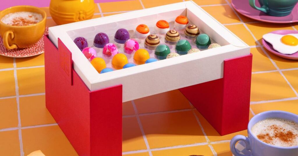 A loja colocou no catálogo temporariamente uma caixa de “café da manhã” (foto; R$ 348,00), com 24 bombons em sabores inusitados e temáticos como salada de fruta, pasta de amendoim com geleia, cappuccino, cinnamon roll, queijo, leite com cereal, iogurte com amora e granola, e chá earl grey.