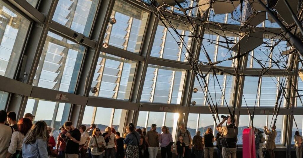 No topo da Torre Glòries está ainda a instalação Cloud Cities Barcelona, criada pelo artista Tomás Saraceno. Suspensa no espaço, a obra convida o público a percorrer 113 “nuvens” interligadas por uma rede de seis quilômetros de cabos de aço tensionados e 5 mil nós de conexão. Em seu interior, uma seleção rotativa de livros sobre crise ambiental e arquitetura especulativa transforma a visita em um convite à contemplação e à reflexão.