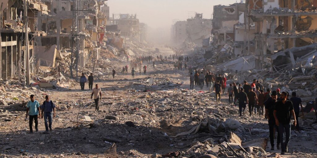 “Assim que ouvimos a notícia da trégua e do cessar-fogo, ficamos muito felizes e nos preparamos para voltar à Cidade de Gaza, para nossas casas. É claro que não há casas – elas foram destruídas”, disse Mahdi Saqla, de 40 anos.