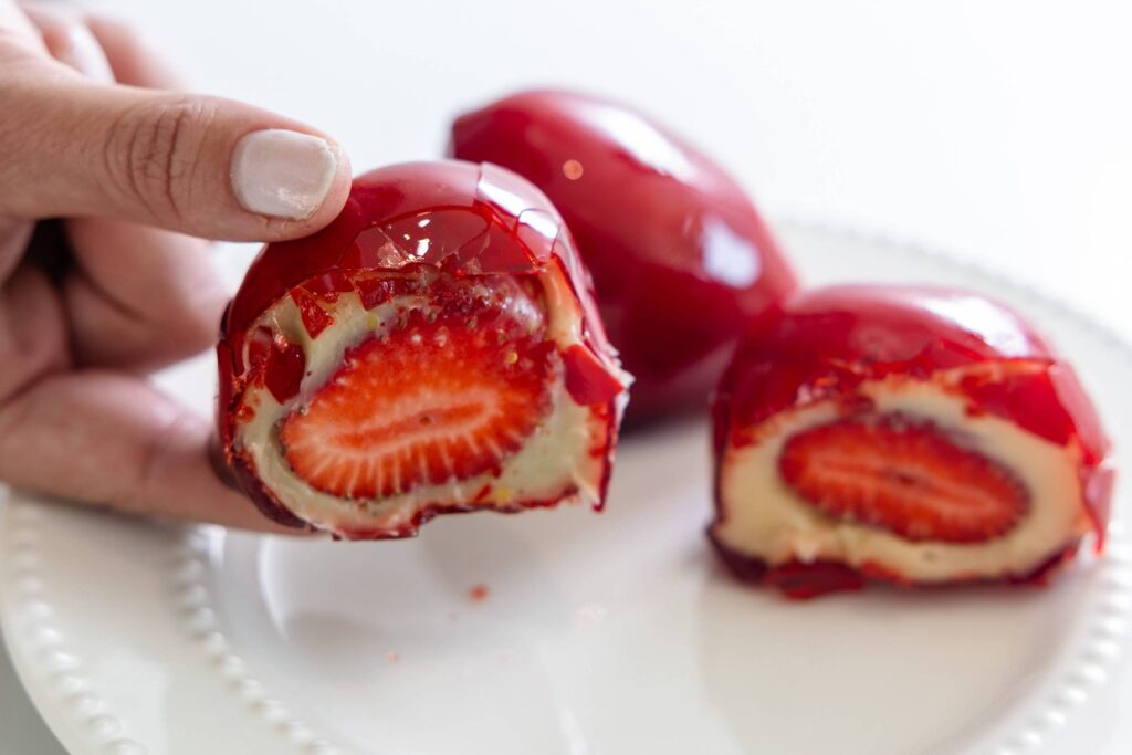 Mesmo fora de época, as profissionais estão se esforçando para conseguirem morangos ideais para a receita, “não pode ser nem muito maduro, nem muito pequeno”, detalha Luísa, que fez o doce pela primeira vez há um mês.