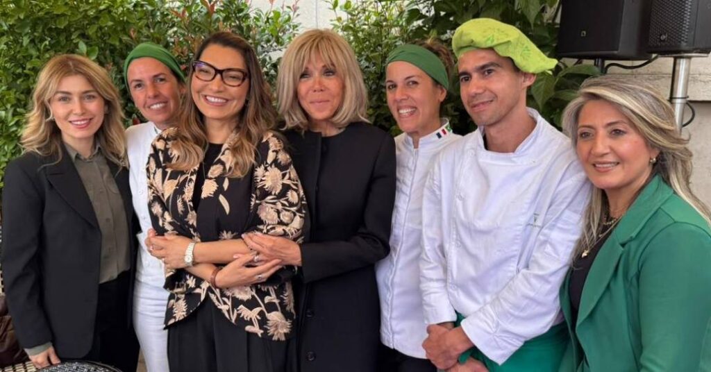 A chefe Morena Leite (de branco), com Janja, Brigitte Macron e convidados: evento com gostinho de Brasil (Divulgação/Divulgação)